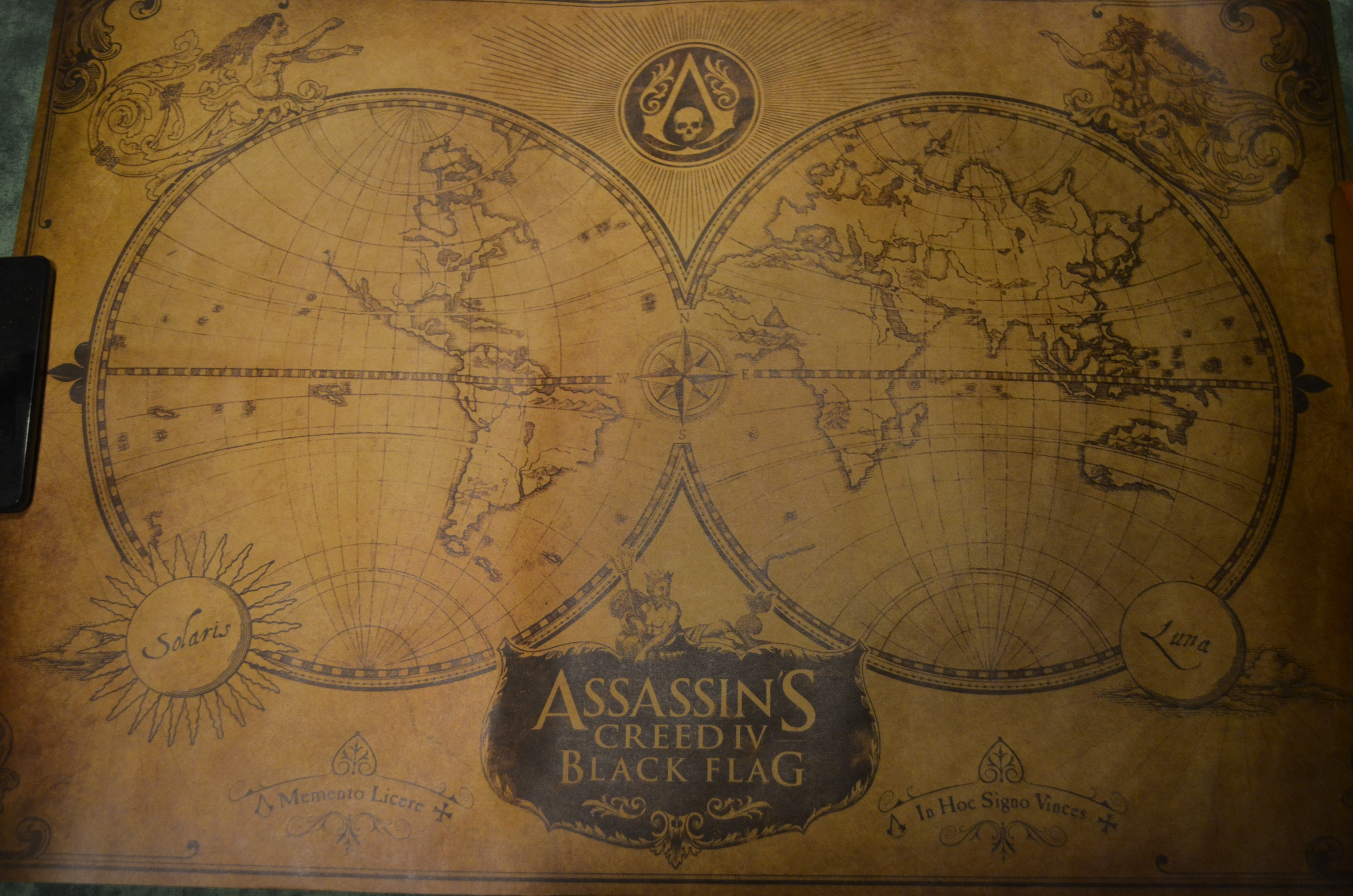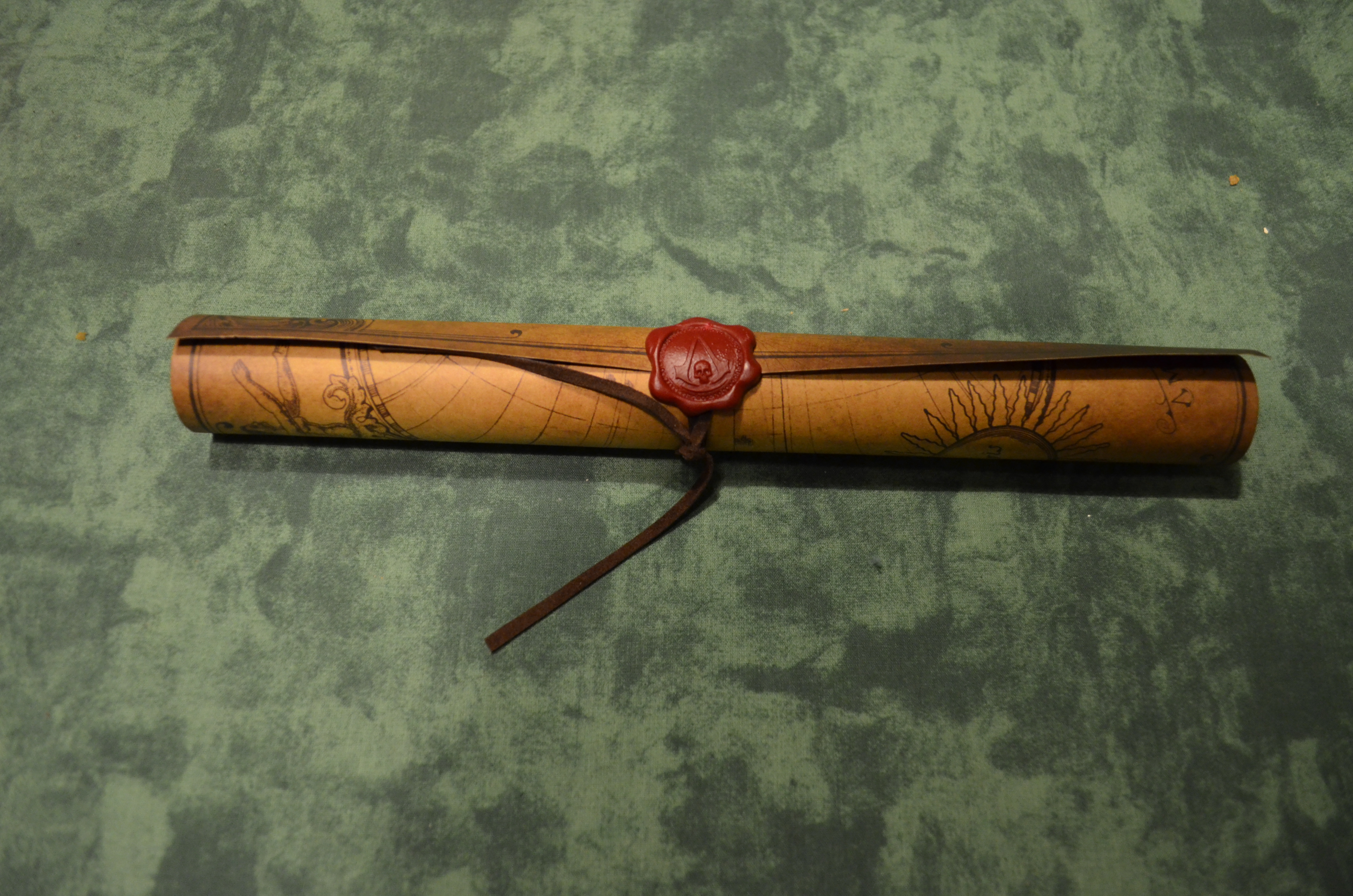 Une fois la boîte ouverte on y trouve en premier lieu une carte aux trésors. Bien roulée et fermée grâce à une ficelle de cuir marquée du sceau de cire rouge des assassins.
