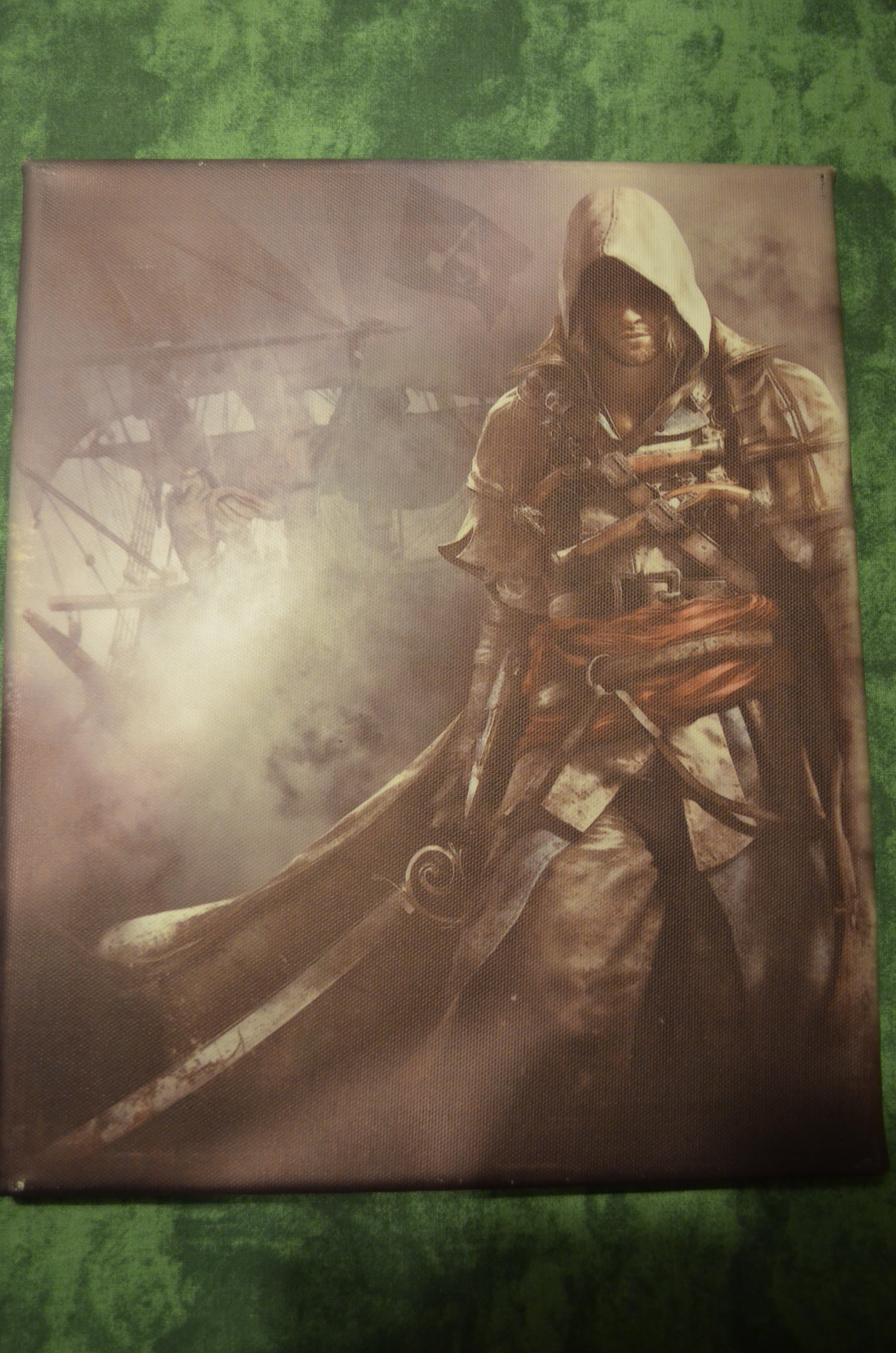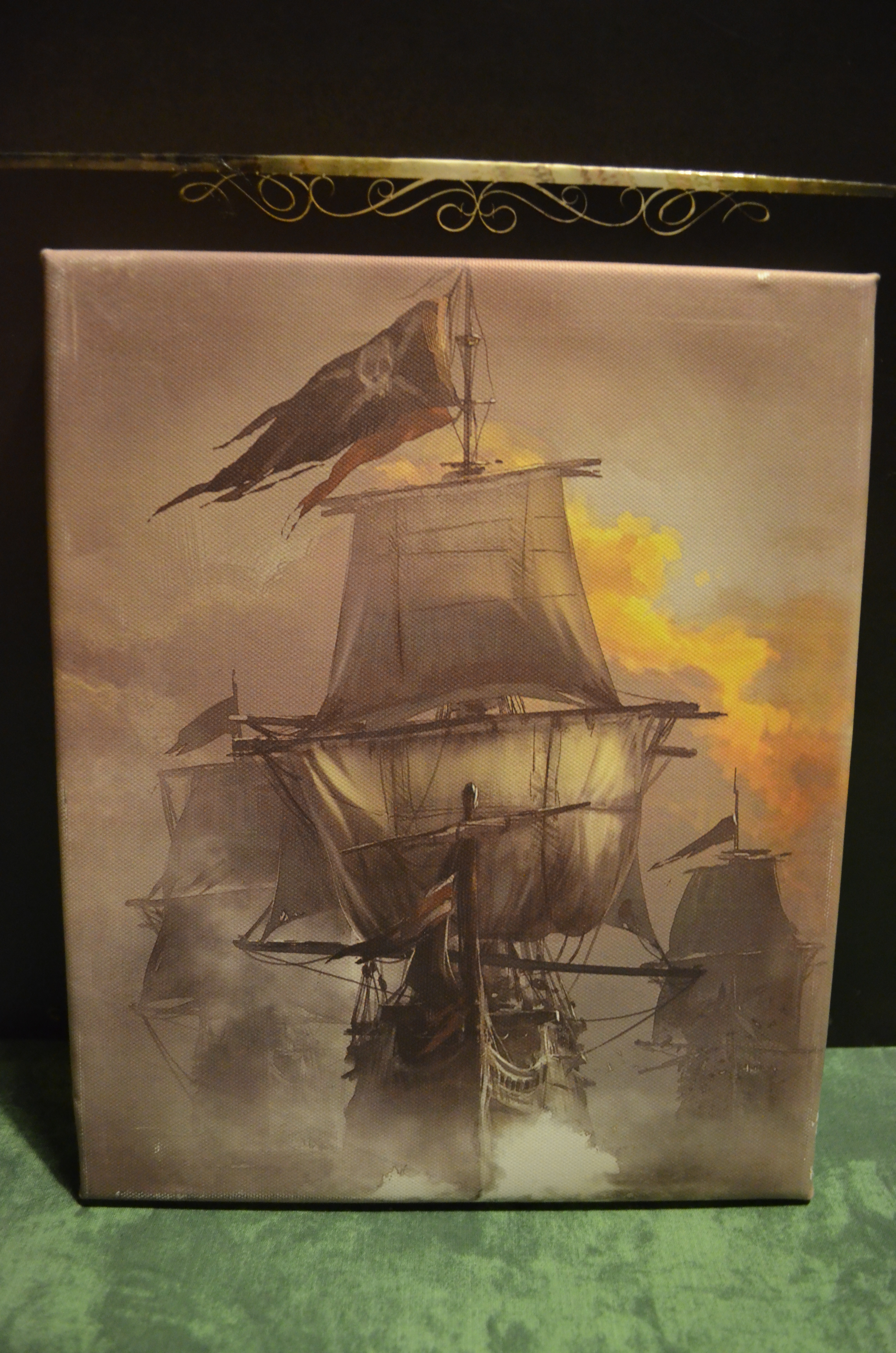 -Ensuite nous avons les deux impressions sur toiles. L’une représentant le Capitaine Edward Kenway qui fait son badass, et l’autre montre trois navires de guerre pirates, avec sans doute le Jackdaw, au milieu, ce n’est pas bien clair. Les deux impressions sont de bonne qualité en plus d’être belles, et si vous avez deux jolis cadres, ça pourrait rendre vraiment bien. Après il vous suffira simplement de les accrocher dans votre salle de bain au dessus de la baignoire, pour que vous aussi puissiez vous prendre pour le plus formidable des pirates !