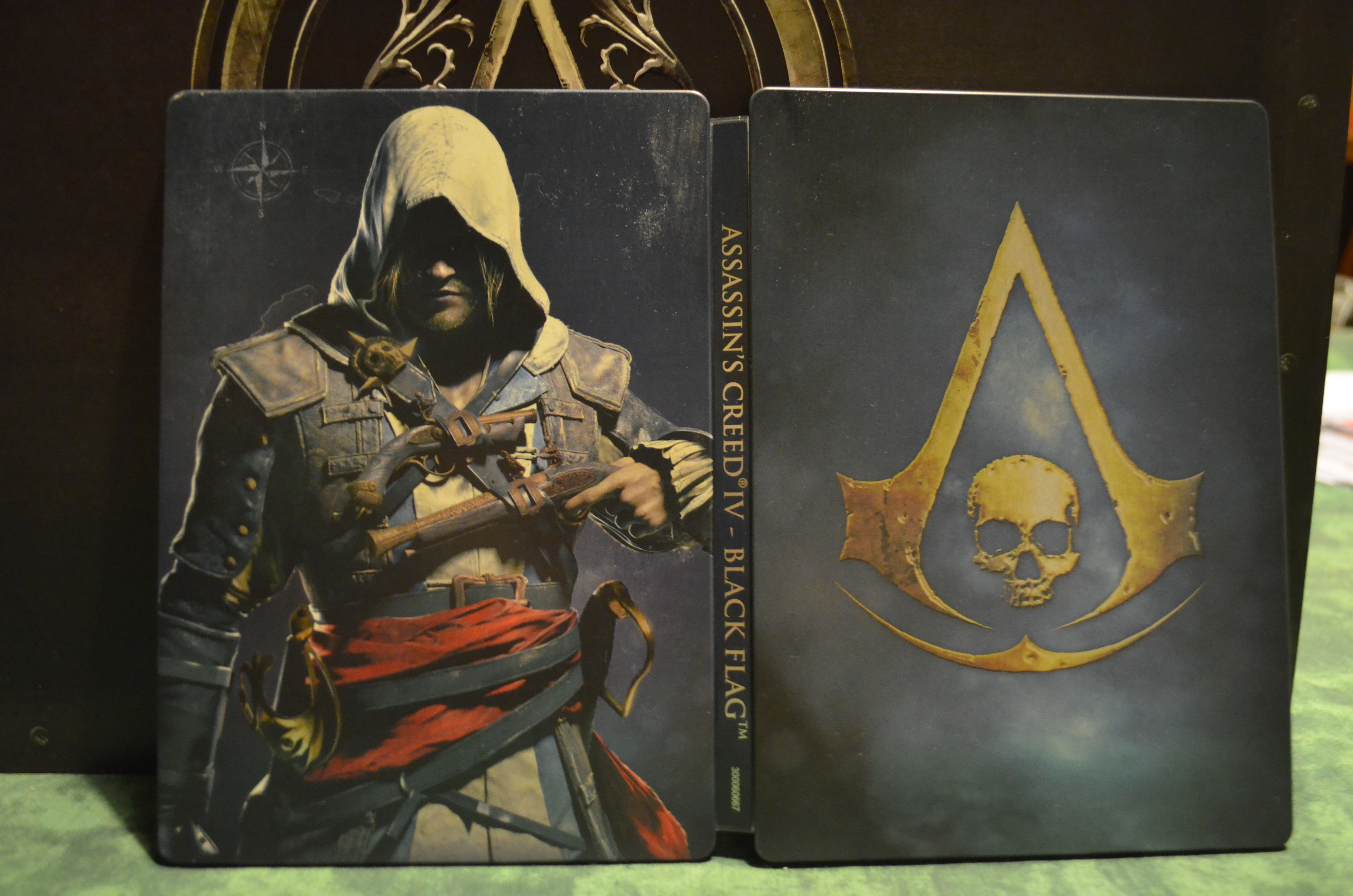-Voila le steelbook aux couleurs du jeu avec au recto, l’emblème pirate des assassins, et au verso, le capitaine Kenway. rien de bien particulier à dire la- dessus, le boitier métal aura forcément plus de gueule que la jaquette de base, pour contenir vos, jeux ou tout autres choses susceptibles d’y entrer, comme un petit croque monsieur pour votre quatre heure.
