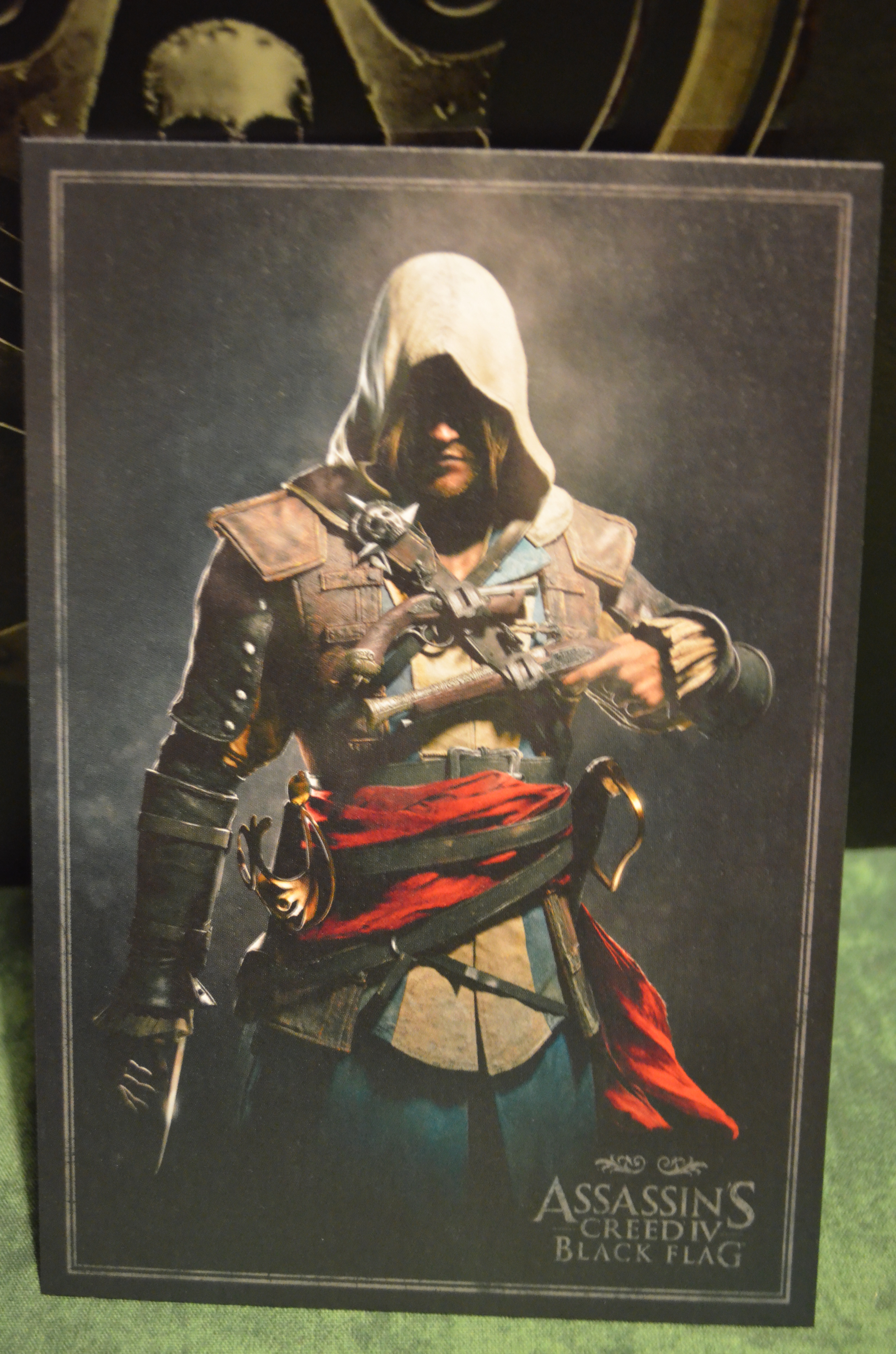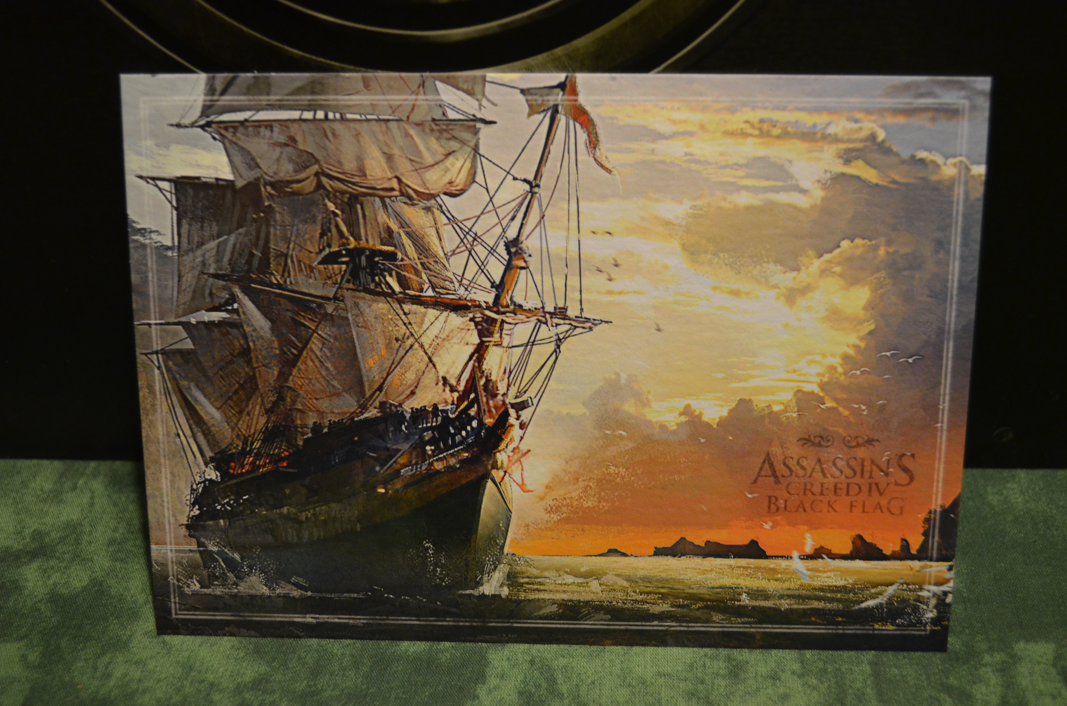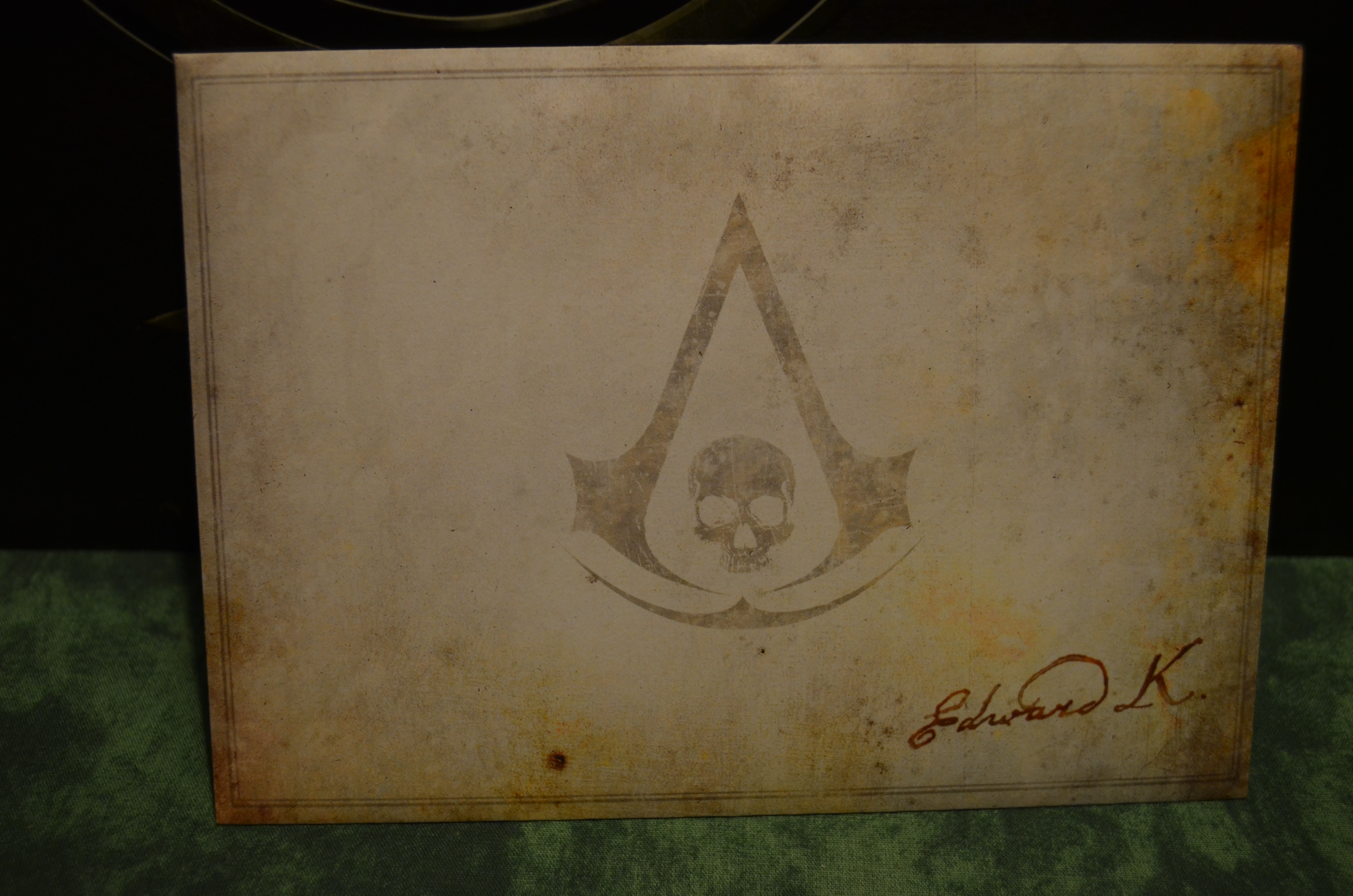 -L’enveloppe des deux lithographies. Déjà l’enveloppe en elle même donne l’illusion d’avoir une enveloppe vieillie, jaunie par les ans et ayant traversé toutes sortes d’épreuves dans le temps. Déjà rien que ça, cela met dans l’ambiance. à L’intérieur on retrouve donc les deux lithos, qui reproduisent un peu ce qu’on à déjà vu dans les impressions sur toiles, à savoir l’une d’ Edward Kenway, et l’autre par contre, représente bien le Jackdaw. Rien de spécial à dire mis à part qu’elles sont belles elles aussi.