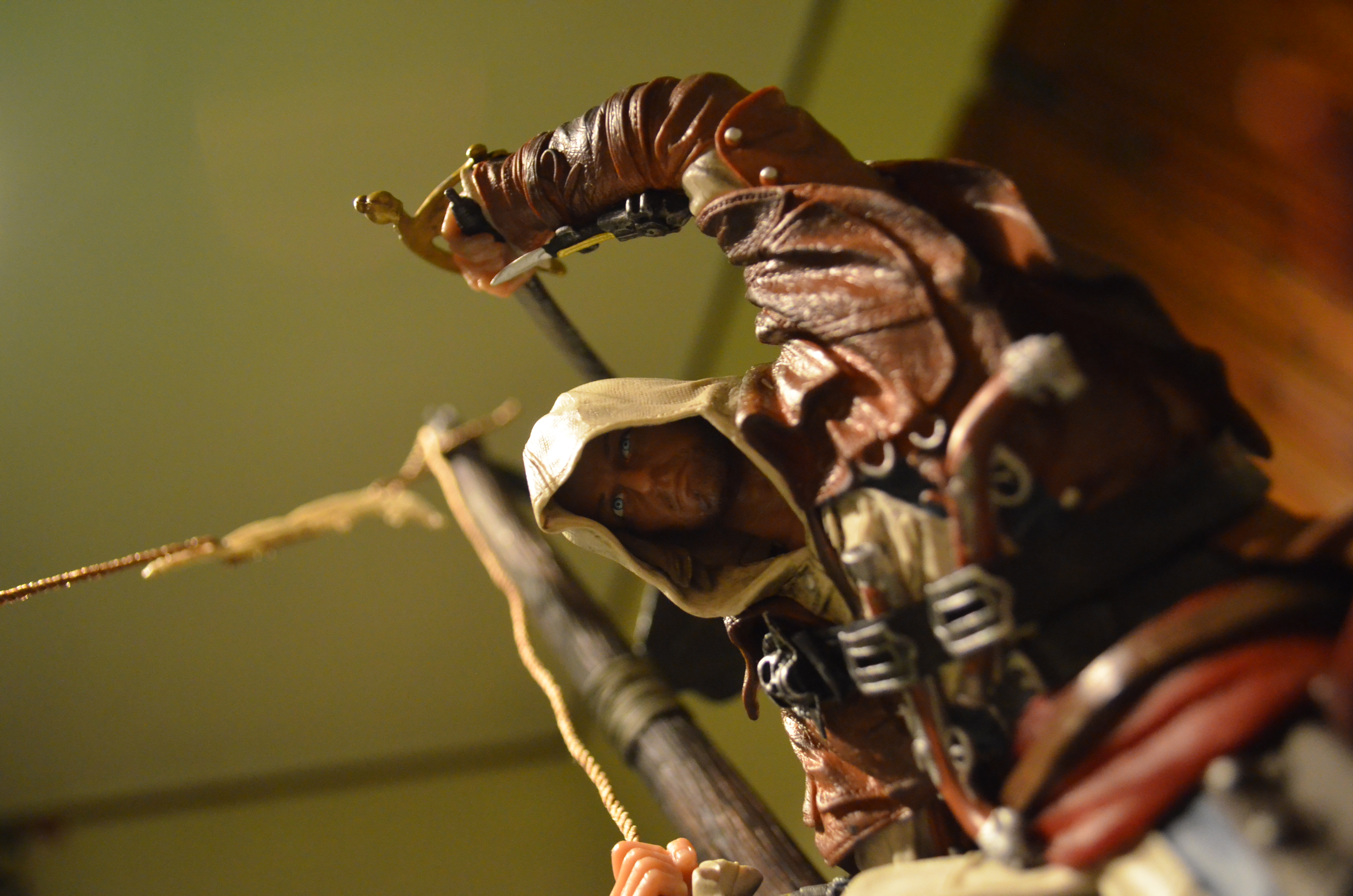 Quoi dire à part magnifique. Le diorama fourmille de détails divers et variés et c’est franchement appréciable. Ok c’est pas de la résine mais de l’espèce de plastique, mais ça ne les a pas empêché de fournir quelques chose de très bonne qualité. Suffit de voir le visage sur la photo que j’ai mise. Ok elle n’est pas super ressemblante au visage de Kenway, mais la tête est humaine. Les yeux sont peints correctement et tout, alors qu’ils auraient très bien pu un peu bâcler cette partie là, vu qu’on ne la voit pas franchement une fois la statue posée.