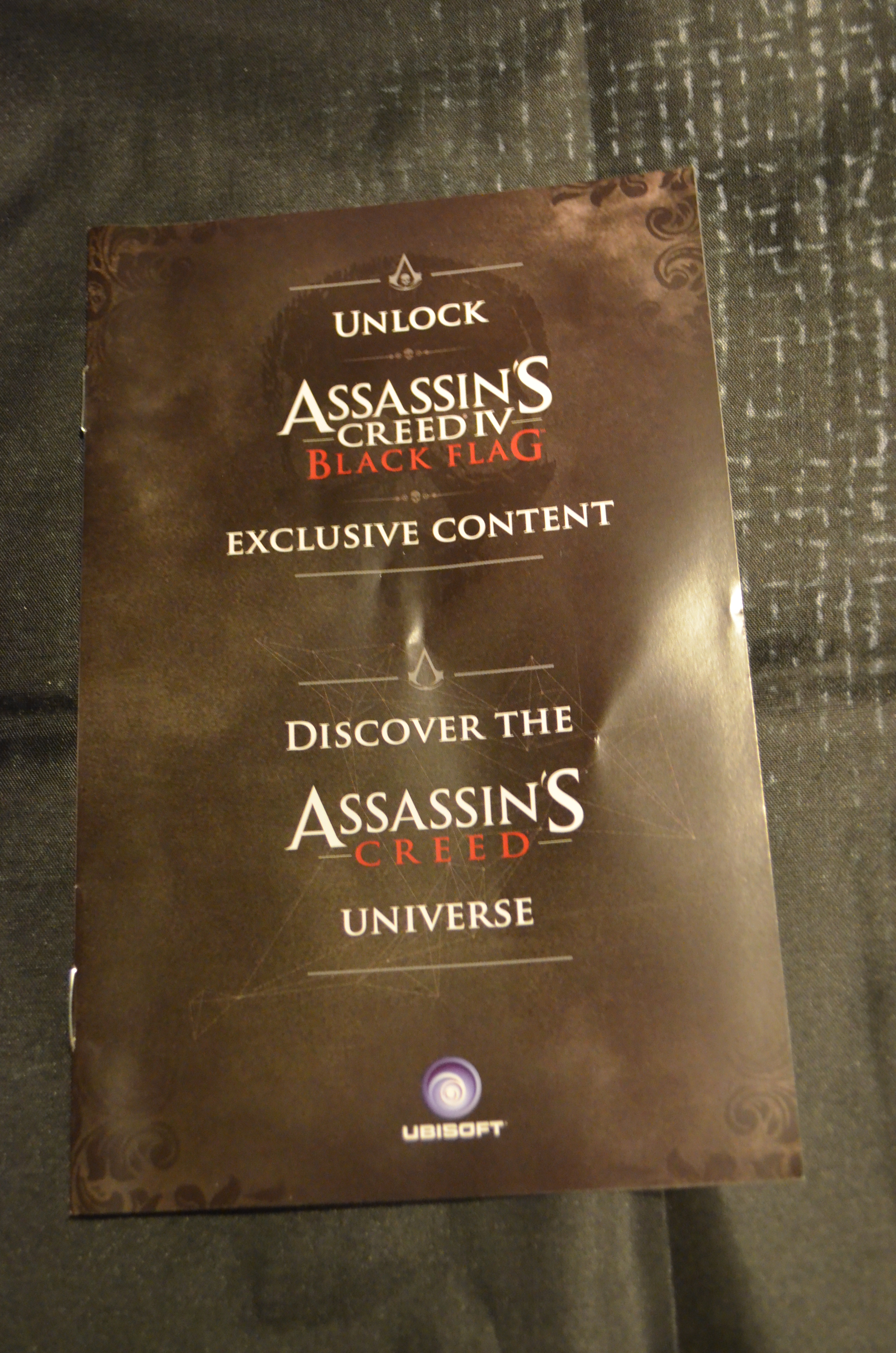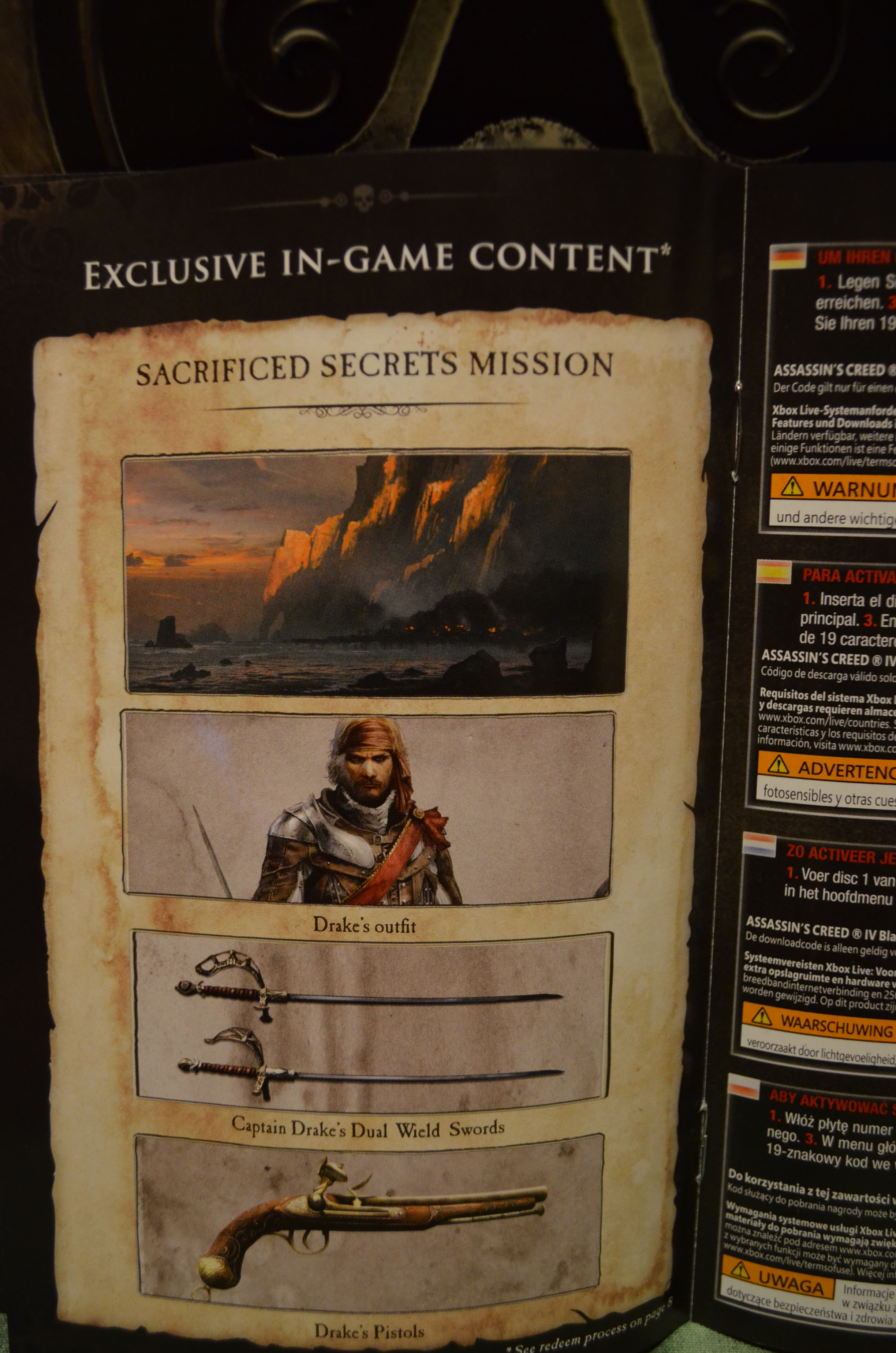 -Avant tout il y a la boite. Elle est de très bonne facture, solide, protège bien tout le contenu et est assez spacieuse pour y faire rentrer votre Caniche adoré si ça vous amuse. Comme son nom l’indique, elle représente un coffre noir arborant le logo pirate de la confrérie des assassins, avec sur le dessus de la boite l’inscription « Dead men tell no tales », qui donne en Français « les morts ne racontent pas d’histoires ».