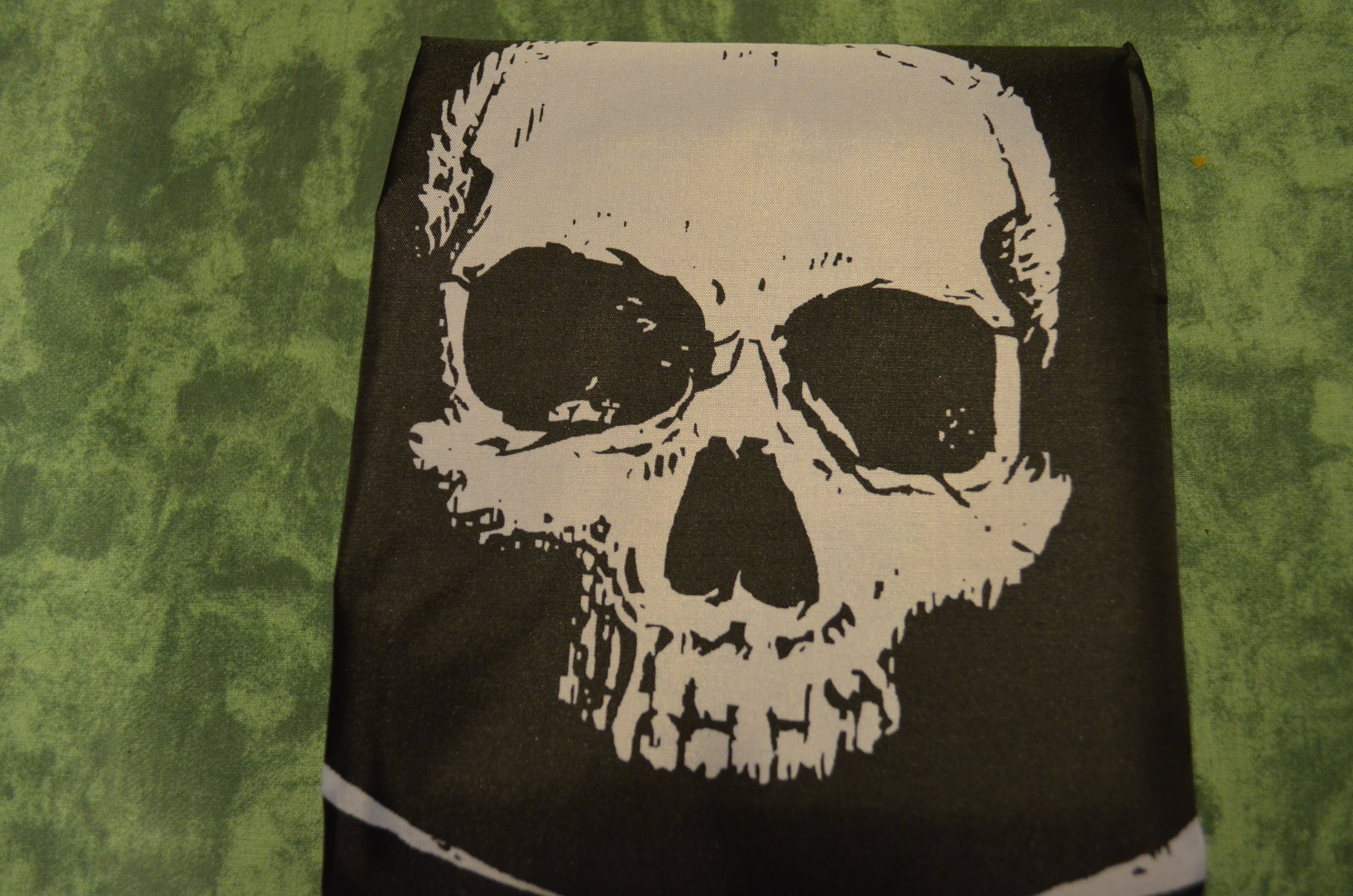 Alors déjà le pliage est parfait, et met bien en évidence la tête de mort. Une fois déplié complètement on se retrouve avec un drapeau réellement énorme qui a vraiment la classe. j’ai été super étonné en le dépliant de voir à quel point il était grand. Je m’attendais à un format de type poster classique, sauf que là, il le fait facile deux fois. Très bonne surprise donc. Il dispose même de deux petits trous à sa base, comme vous pouvez le voir sur la photo, pour pouvoir l’accrocher comme un véritable drapeau. Nul doute que ça fera son petit effet si vous l’accrochez devant votre maison, un peu comme font les américains avec leur drapeau, les voisins devraient être content. Vous pouvez éventuellement vous l’accrocher pour en faire un cape, et courir bêtement dans tous les sens en criant que vous êtes super pirate, mais bon ça vous regarde hein.