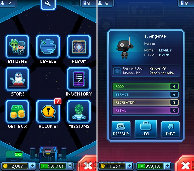 Pour les gens désirant utiliser ce genre de service, votre monnaie réelle vous permettra de vous procurer des « Bux Impérial » représentés par les billets verts sur la photo. Grâce à eux, il vous sera possible d’acheter différents costumes pour vos Bitizens (c’est le nom officiel des habitants) tirés des films, d’accélérer le développement de vos étages (plus vous vous agrandirez, plus cela prendra de temps, bien évidemment, devenant même interminable à un certain niveau), vous pourrez choisir le type d’étage qui sera installé lors d’une construction (par exemple en construisant un étage résidentiel, vous ne savez pas à l’avance lequel vous allez avoir, ça peut très bien être les appartements de Mos Espa, comme ceux de Coruscant, c’est complètement aléatoire. Avec les Bux vous pouvez choisir lequel prendra place). Enfin techniquement les Bux impériaux vous permettent de tout faire beaucoup plus vite avec une plus grande facilité de choix.