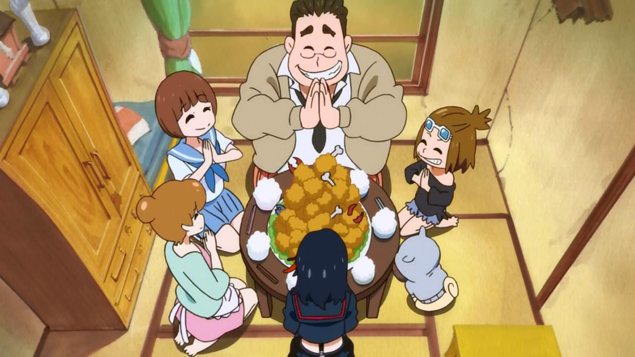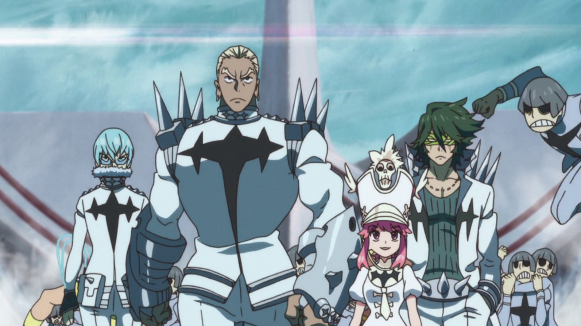 Ryuko bénéficira également de l’aide de quelques personnes dont Mako Mankanshoku et sa famille complètement fracassée du bulbe, Aikuro Mikisugi un professeur à la double personnalité, Tsumugu Kinagase un motard punk qui utilise une mitraillette à aiguilles, et Senketsu un vêtement vivant qui parle……. oui oui vous avez bien lu, j’y reviendrai juste après.