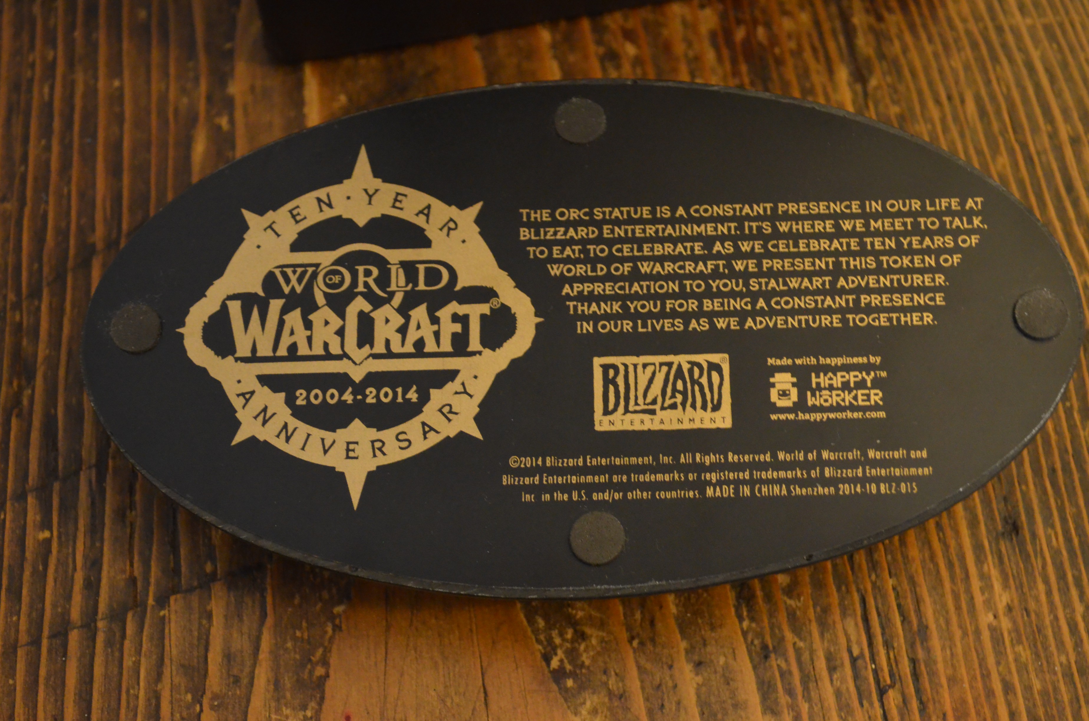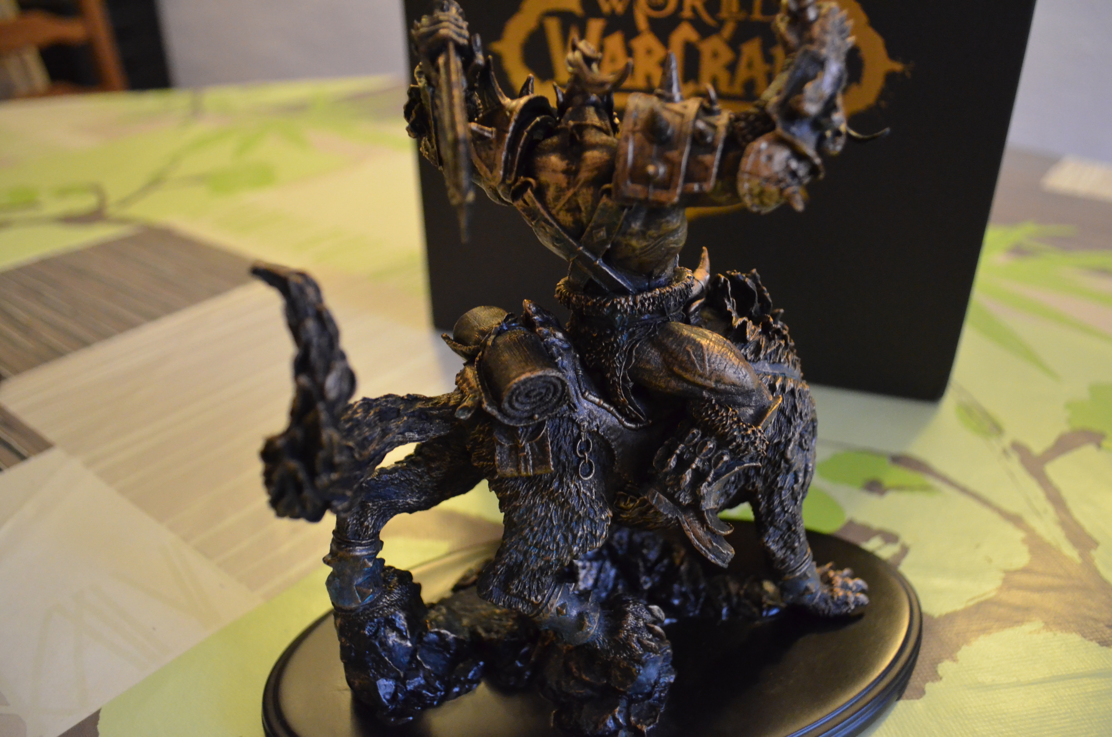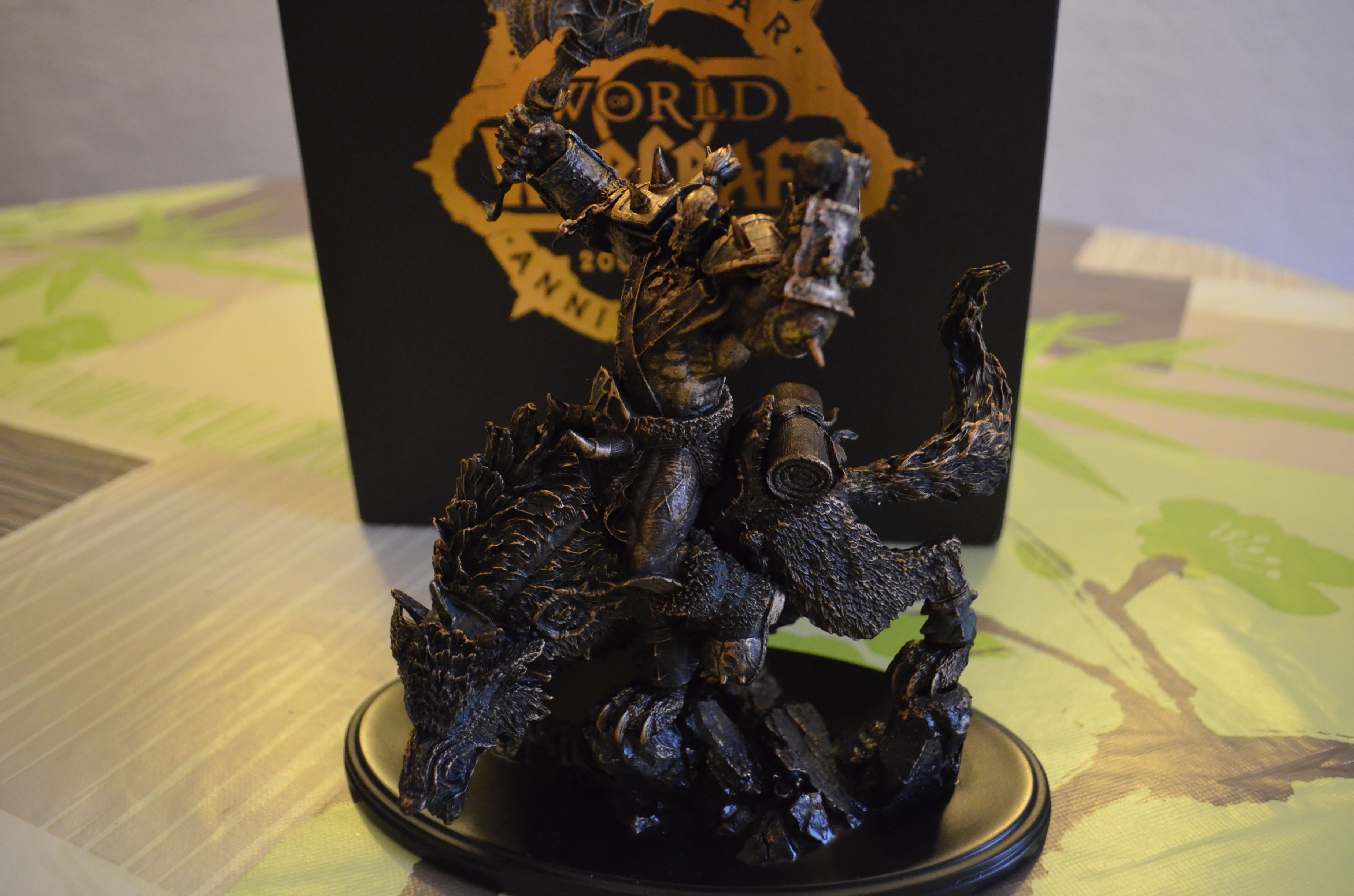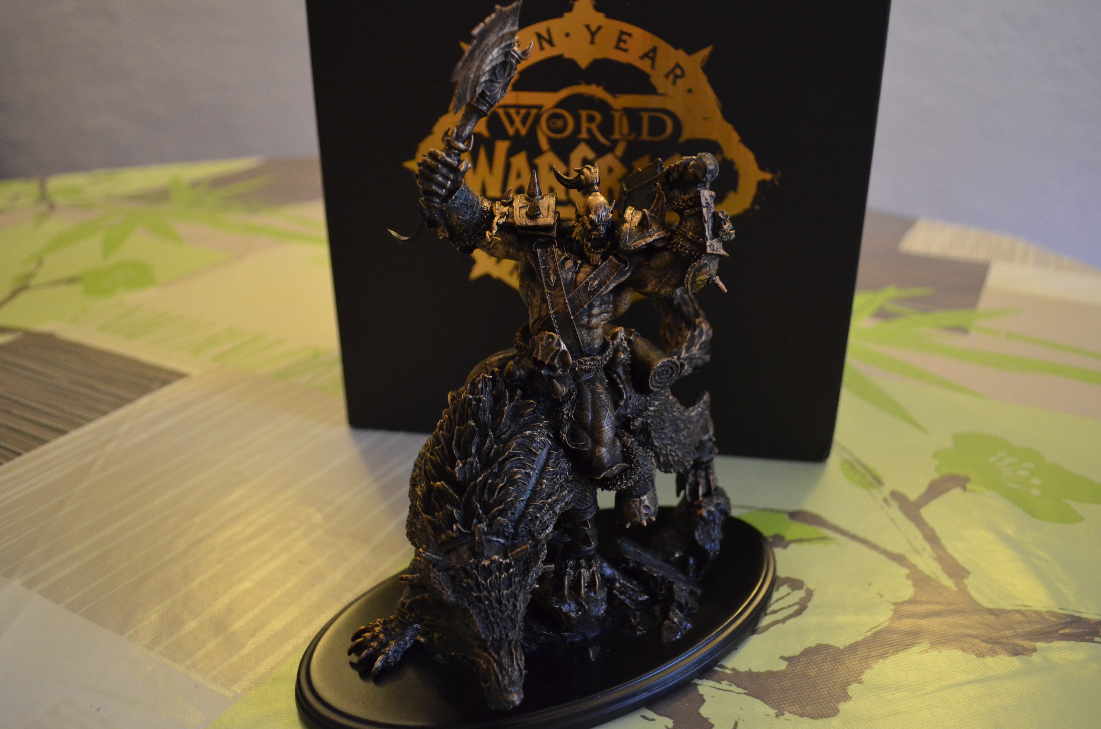 Salutations mes chers Pouikeurs adorés ! J’avais honteusement oublié de vous en parler au moment ou je l’ai reçu, et je compte bien corrigé cette erreur dès maintenant ! Comme vous le savez sans doute, ou pas, en novembre 2014 Blizzard, qui fêtait alors les 10 ans du MMO Worl of Warcraft avait décidé de remercier ses abonnés les plus fidèles en leur envoyant une réplique miniature de la statue d’Orc chevauchant un loup de guerre qui trône fièrement devant leurs locaux à Irvine.